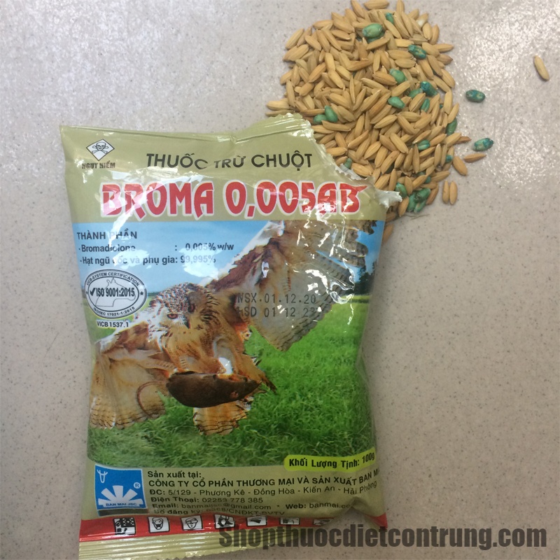 Broma 0,005AB là sản phẩm thuốc diệt chuột chống đông máu dạng lúa, có công dụng phòng trừ và kiểm soát chuột. Thuốc diệt chuột Broma có dạng hạt lúa, được bán chủ yếu cho các công ty diệt chuột trên thị trường. Broma có thể áp dụng hiệu quả để diệt chuột trong nhà, trong công ty, tòa nhà, hầm để xe, kho bãi, cánh đồng, nhà máy…